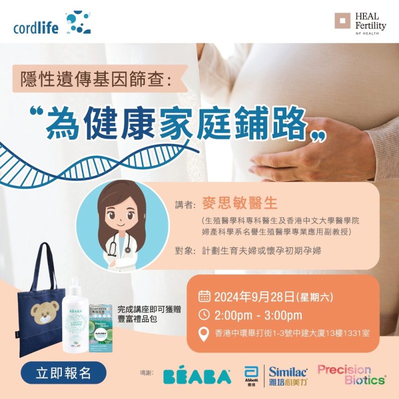 講者:麥思敏醫生(生殖醫學科專科醫生及香港中文大學醫學院婦產科學系名譽生殖醫學專業應用副教授)對象:計劃生育夫婦或懷孕初期孕婦日期:2024年9月28日(星期六) 時間:14:00 – 15:00地點:香港中環畢打街1-3號中建大廈13樓1331室