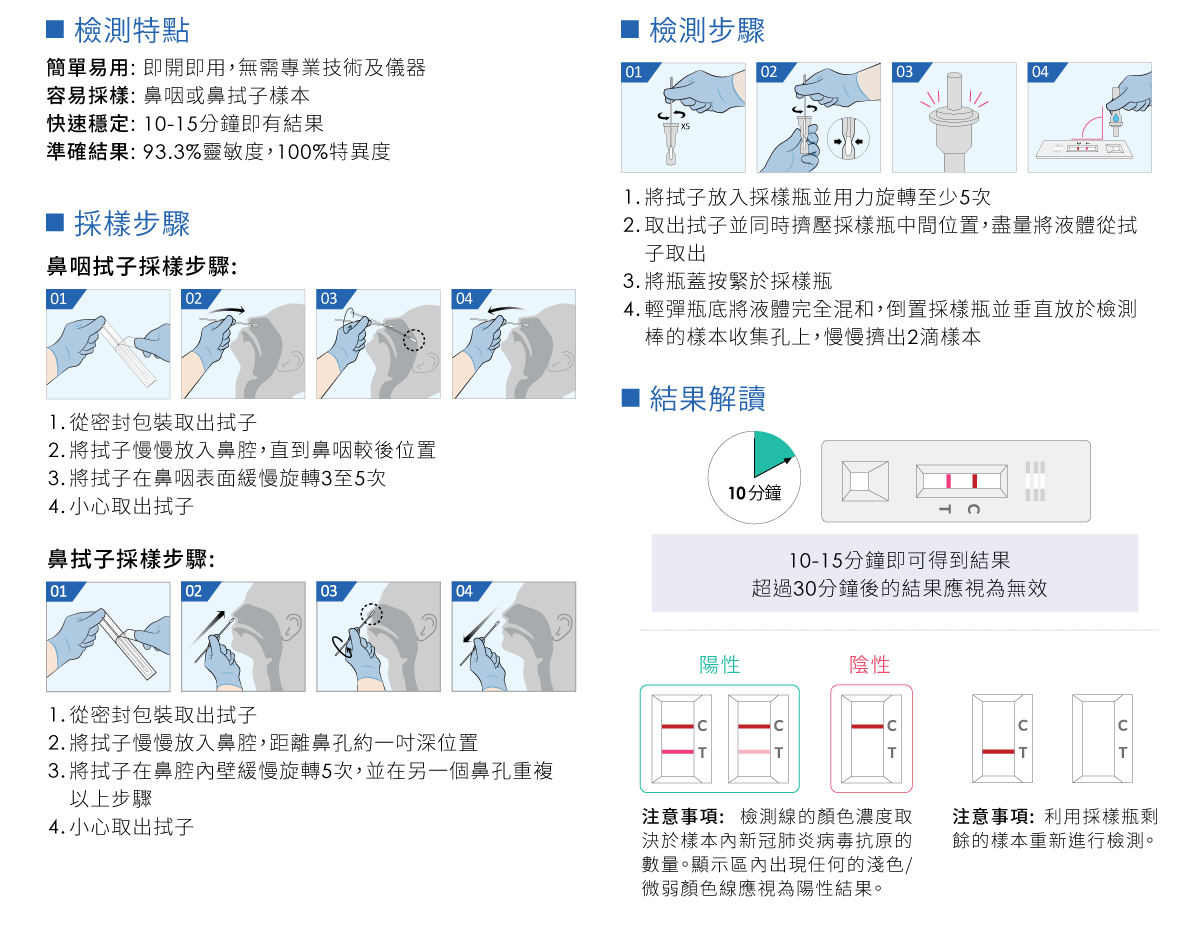 韓國製造 EDGC™ RapidCare 新冠肺炎病毒抗原快速測試套裝快速免疫層析測定技術,用於定性檢測鼻咽內的新冠肺炎病毒的核殼蛋白抗原,最快10分鐘即有結果。